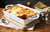 4. Sett formen i stekeovn på 225° C og stek i 30-40 minutter. Kjenn etter med en pinne eller spiss kniv om pastaen er mør. La lasagnen hvile noen minutter før servering.